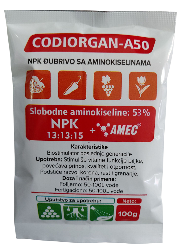 Upotreba: Codiorgan-A50: Poboljsava metabolizam biljke u fazama razvoja kada je to najpotrebnije(nicanje, intenzivan rast, cvetanje, zrenje). stimulise razvoj korena i njegove aktivnosti, na svakom tipu zemljista, za sve vrste useva. povecava biolosku aktivnost u zoni korena, razvoj zila i apsorciju.